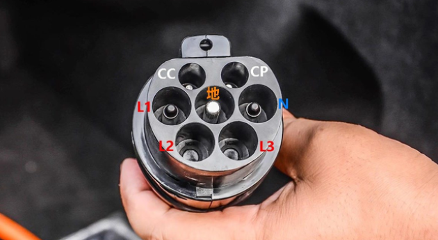 The new national standard AC charging interface adopts a seven-hole design. The picture shows the AC charging gun head, and the corresponding holes have been labeled. CC and CP are used for charging connection confirmation and control guidance, respectively. N is the neutral wire, L is the live wire, and the center position is ground. Among them, the L live wire can use three holes. Common 220V single-phase AC charging stations generally use the L1 single hole power supply design.