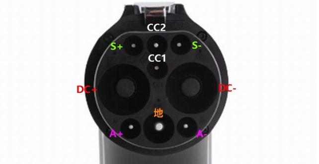 The new national standard DC ev charging pile adopts a “nine-hole” design, as shown in the picture of the DC charging gun head. The top center holes CC1 and CC2 are used for power connection confirmation; S+ and S- are communication lines between the off-board ev charger and the electric vehicle. The two largest holes, DC+ and DC-, are used for charging the battery pack and are high-current lines; A+ and A- connect to the off-board charger, providing low-voltage auxiliary power to the electric vehicle; and the center hole is for grounding.